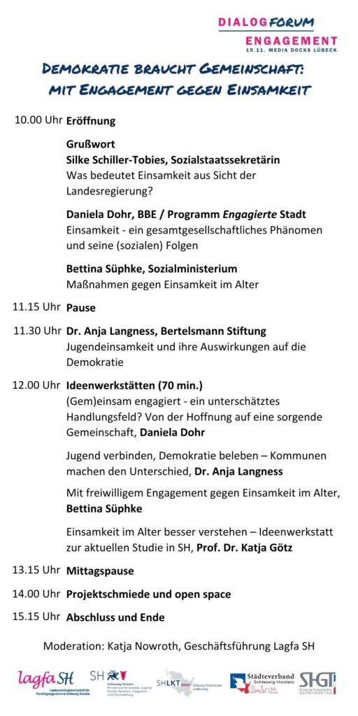 Die lagfa Schleswig-Holstein, die Kommunalen Landesverbände SH sowie das Ministerium für Soziales, Jugend, Familie, Senioren, Integration und Gleichstellung laden herzlich ein zur Engagementkonferenz 2025 unter dem Motto „Demokratie braucht Gemeinschaft: mit Engagement gegen Einsamkeit“.